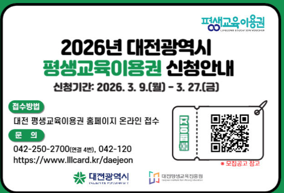 관심 있는 분들은 신청 일정과 대상 기준을 확인한 뒤 평생교육이용권을 활용해 다양한 교육 프로그램에 참여해 보시기 바랍니다.